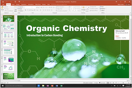 通過全新的幻燈片切換和改進的動畫任務窗格創(chuàng)建、協(xié)作和高效展現(xiàn)自己的思路。 幻燈片旁邊按線索組織的備注幫助您將反饋融入到演示文稿。 此外,演示者視圖在 Mac 上顯示當前幻燈片、下一張幻燈片、備注文稿以及計時器,同時僅在大屏幕上向您的觀眾投影演示文稿。